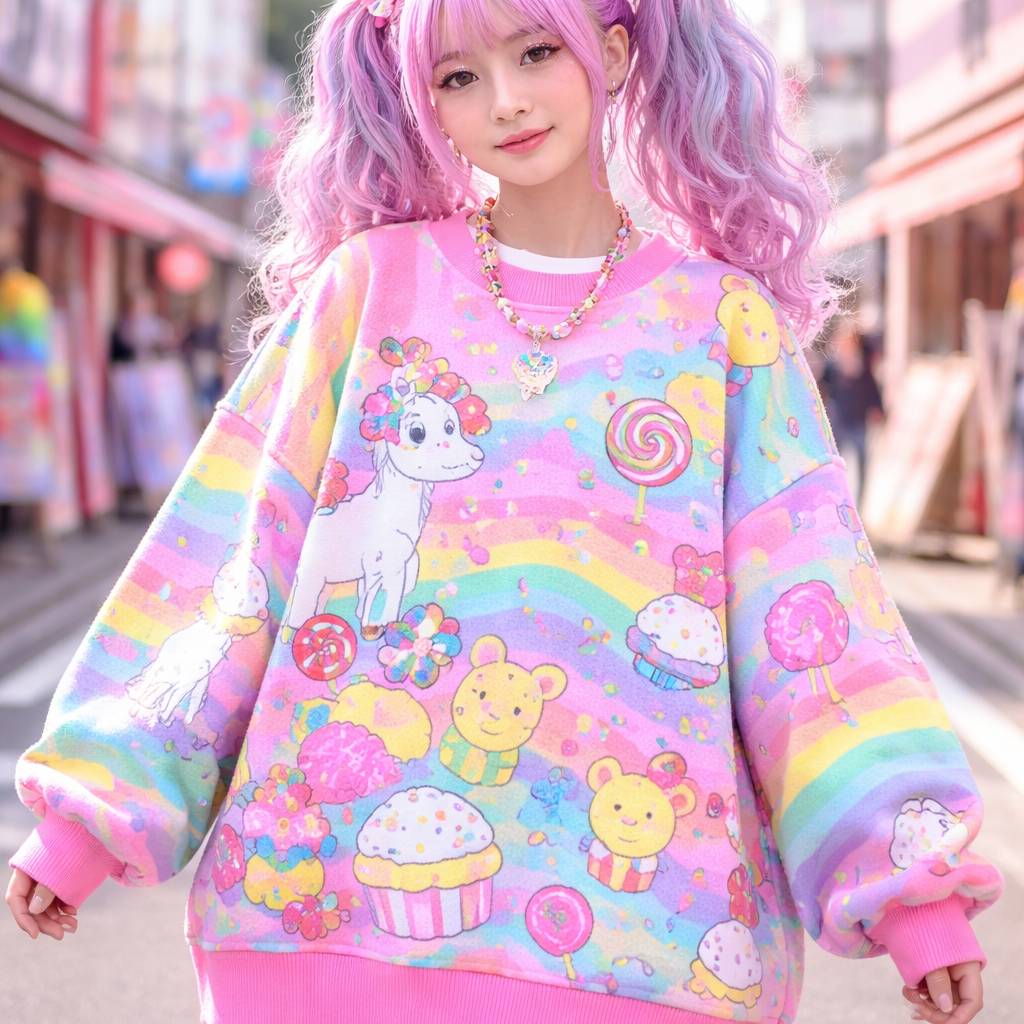 Japanese Street fashion design: Oversized cotton sweater, vibrant neon colors, cartoon candy land pattern. Loose fit, dropped shoulders, playful and cute Japanese street style.