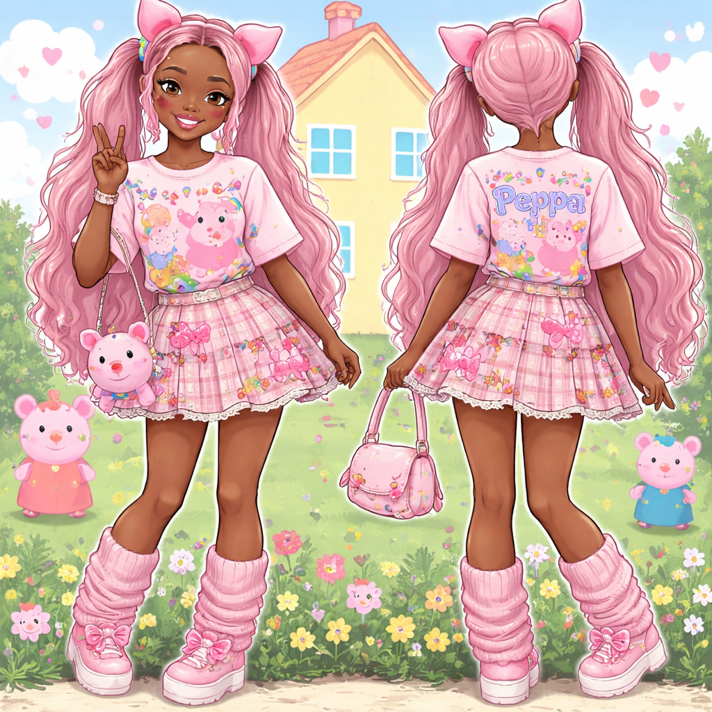 A kwawii shirt with peppa pig on it and and a peppa pig skirt pink leg warmer girl shoes long pink hair brown skin pig ear headband peppa house in the back round a yellow house with a orange roof and rosy pink checks and a baby , japanese_street style, show front and back