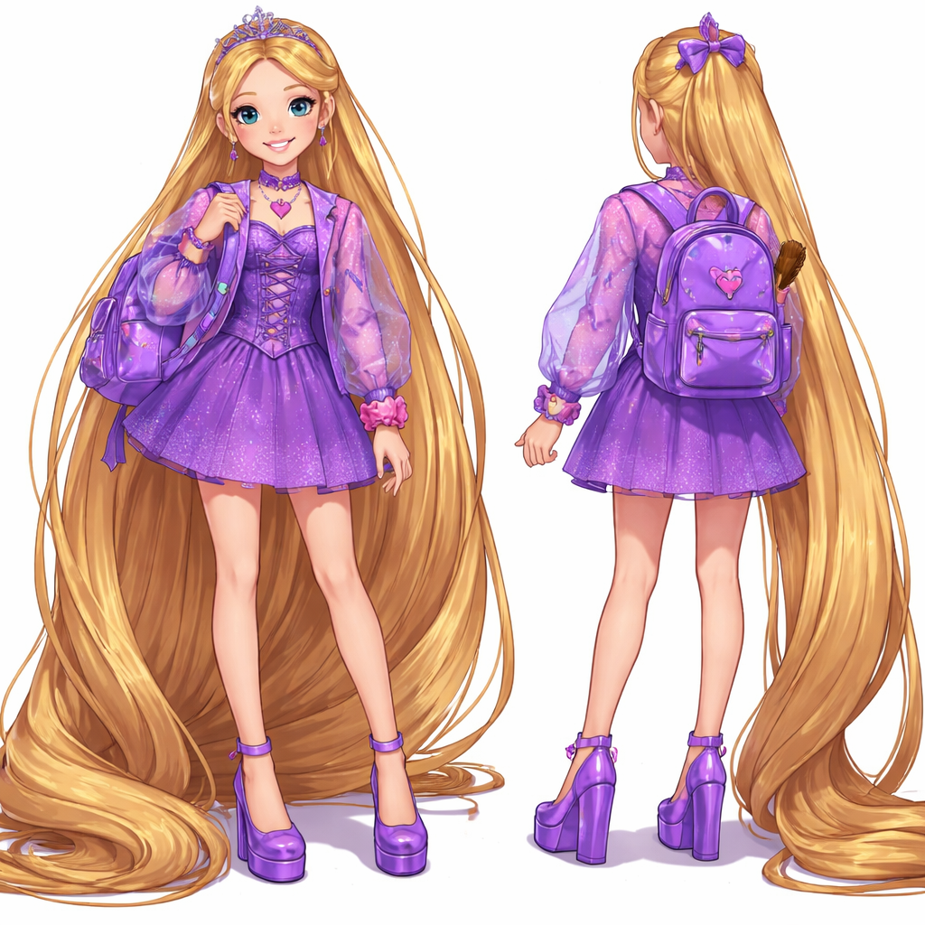 A Disney princess rupenzle 12 year old girl with a school look a hair thee yards long purple short dress with puffy sleeves purple heals crown purple translucent jacket and a purple backpack with a a brown hairbrush , streetwear style, show front and back