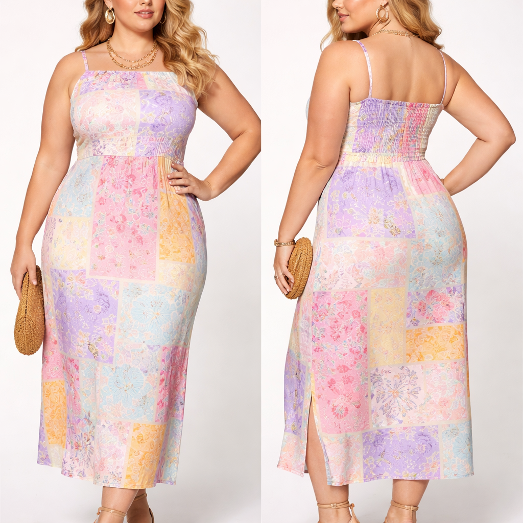 - plus size dress - colorful, pastel colors - fabric viscose - elastic from the back - midi length - boat neck - tight from neck to lower waist - sleeveless , bohemian style, show front and back