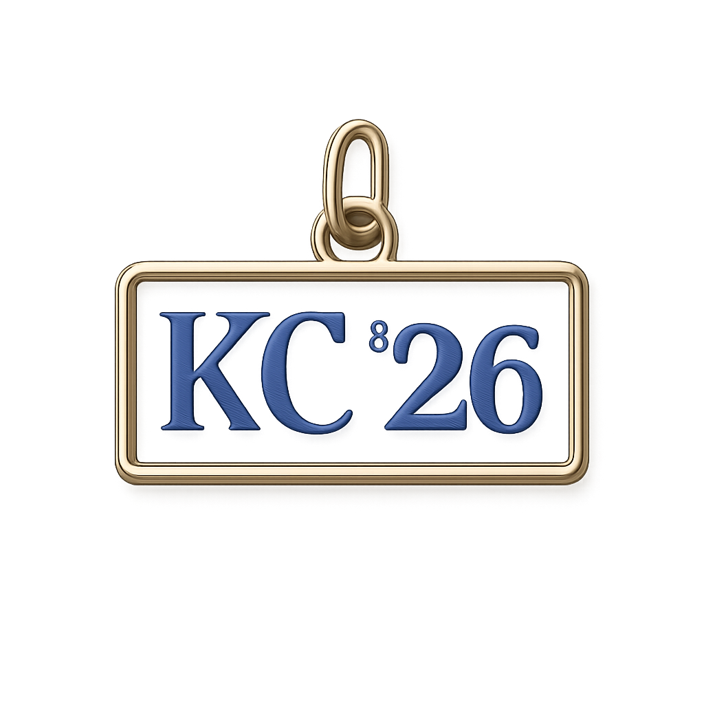 Design a 1 inch enamel charm that says KC ‘26 in rectangle design use blue letters and white background with gold as the...
