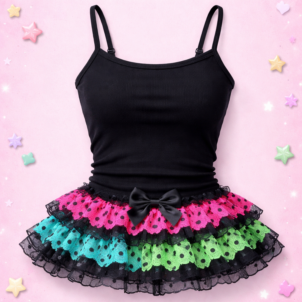 Japanese Street fashion design: Fitted black cotton tank, lace ruffle hem in hot pink, aqua, and bright green with black polka dots. Edgy Harajuku style.