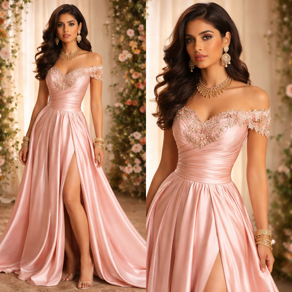 A Female Dress design, made of Satin, for Party, suitable for Spring. India fashion aesthetics.