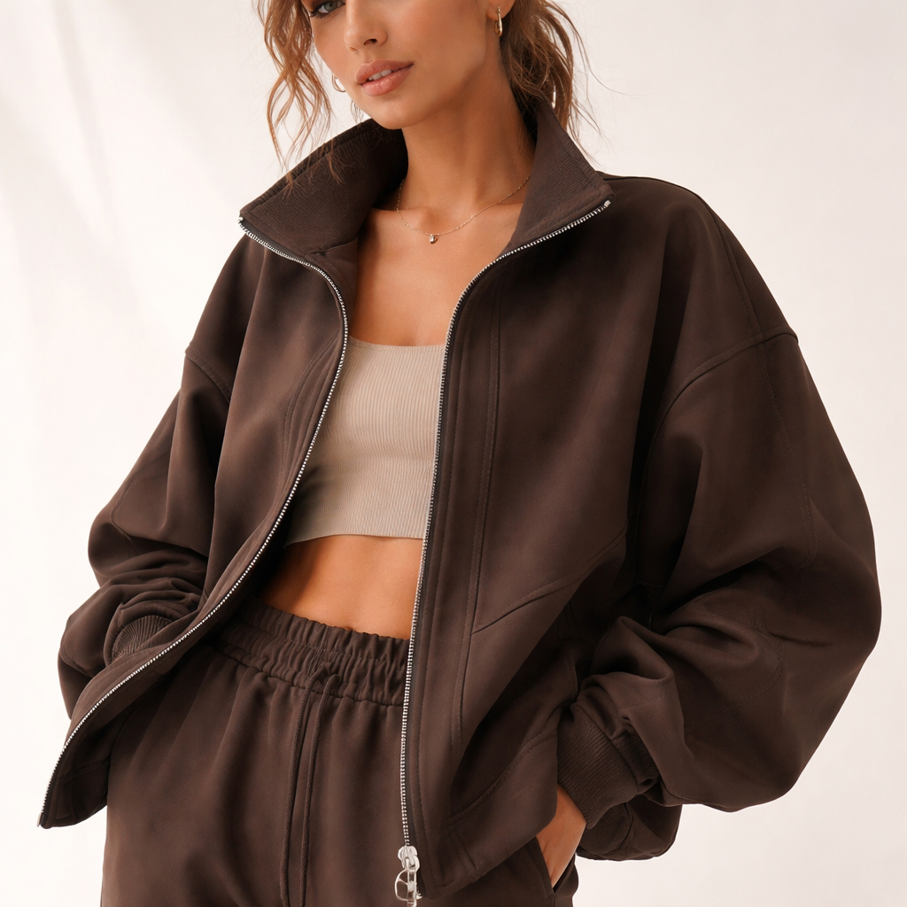 Sportswear fashion design: Dark brown oversized zip-up jacket, Milton cotton. Relaxed silhouette, structured fit. Subtle raised seam lines. Silver zipper with 'f'-shaped pull. Styled open with dynamic folds. Feminine, minimal, athleisure.