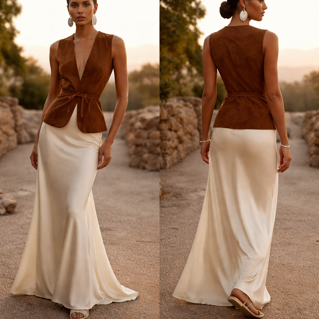I want a structured, butter-soft suede vest in a deep tobacco hue, worn as a top with nothing underneath to expose the collarbone and give it a sharp, modern edge. We’ll contrast that heavy, matte hide with a fluid, ivory silk-satin maxi skirt that’s cut on the bias so it ripples like liquid around your ankles as you move. To bridge the two textures, we’re cinching the waist with a skinny, tonal suede belt tied in a casual knot. On your feet, a minimalist cord sandal in a matching cream keeps the silhouette grounded but airy. We’ll finish with oversized, sculptural silver earrings to add a cool, metallic flash against the warm earth tones. It’s an outfit that feels both ancient and incredibly current—perfect for a sunset dinner where you want to look untouchable but effortless., show front and back