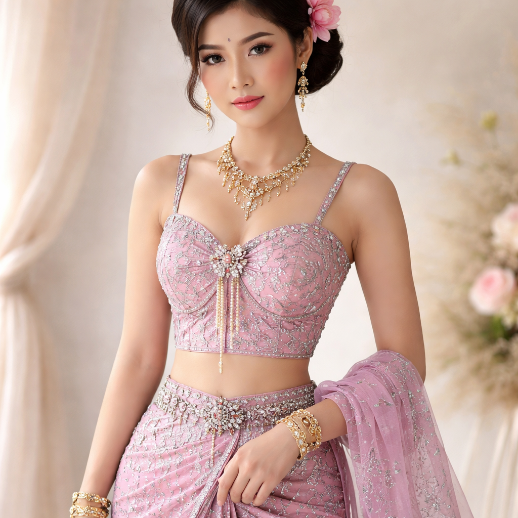 A Skirt design, suitable for Spring. Consider Indian fashion aesthetics — consider saree, lehenga, salwar kameez, kurti,...
