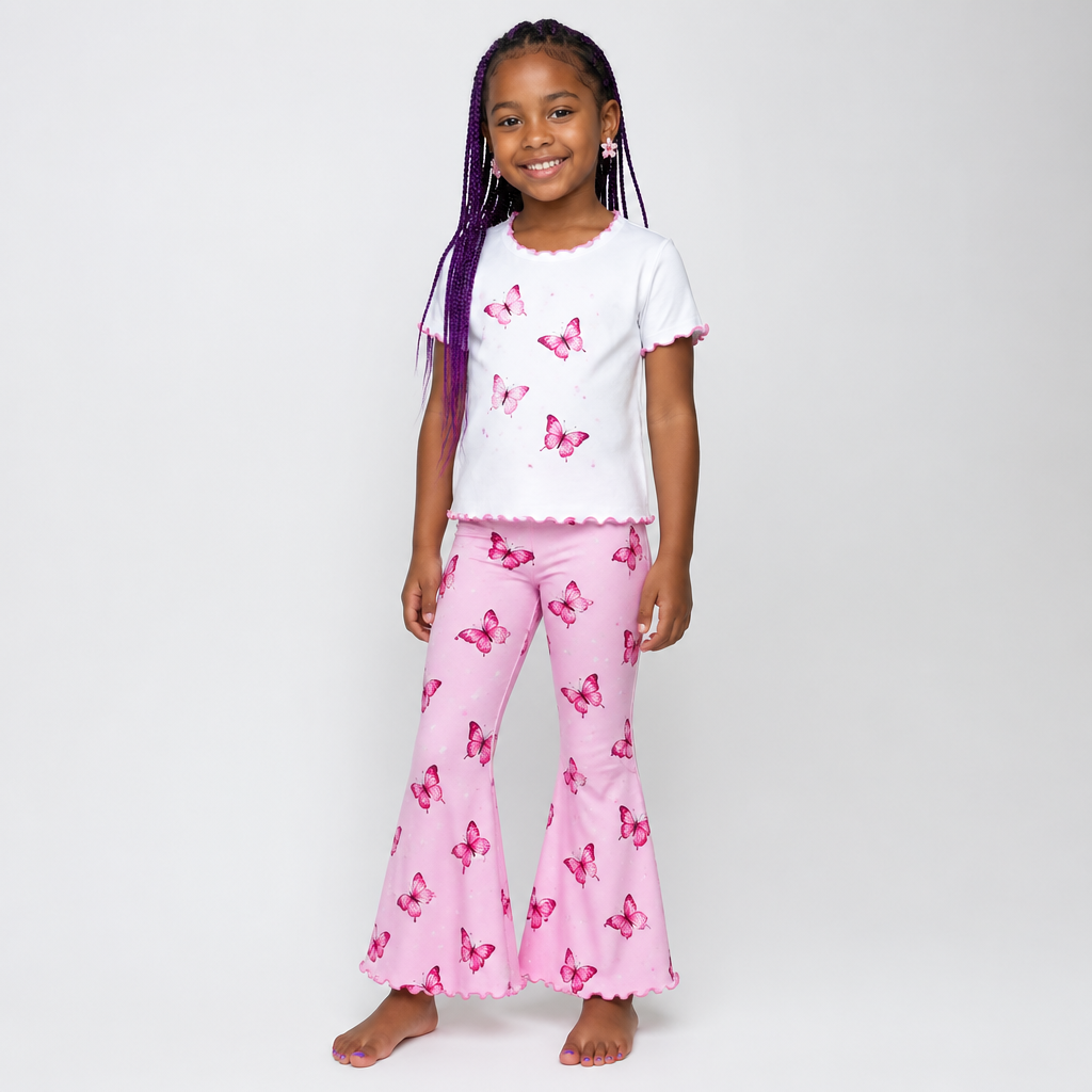 photorealistic fashion design, A black skin 9 years old with a braided straight hair painted purple toe nails and flower earrings and a white pajama shirt that says sleep vibes with butterflies and pink flare pajama pants with hot pink butterflies girl shirt says sleep vibes straight hair paint purple toenails flowers earrings super young looking but 9 years old , sleepwear style, just the design no text