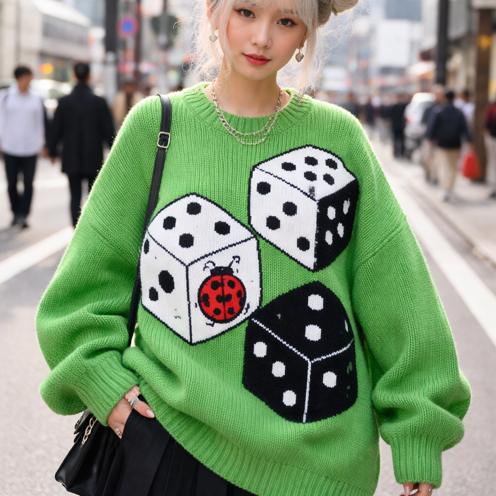 Japanese Street fashion design: **Japanese Street Style Prompt:** Bright green chunky knit sweater with clean lines. Features large black and white dice pattern, with one die face showing a cute red ladybug. Oversized fit, drop shoulders.