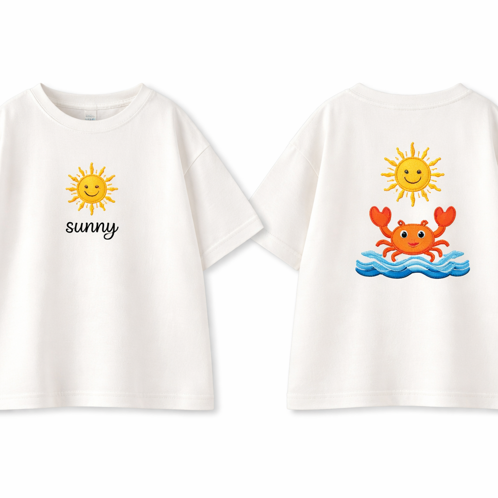 Oversized kids T-shirt Colour white With embroidery sun on the chest and black print under the sun ( sunny) On the back in the middle starting up embroidered sun and under the sun embroidered crab under the crab embroidered sea wave , show front and back
