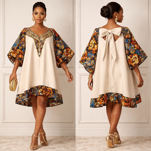 Create a photo of abeautiful short bubu gown made with a 20%Ankara and 80%plain material