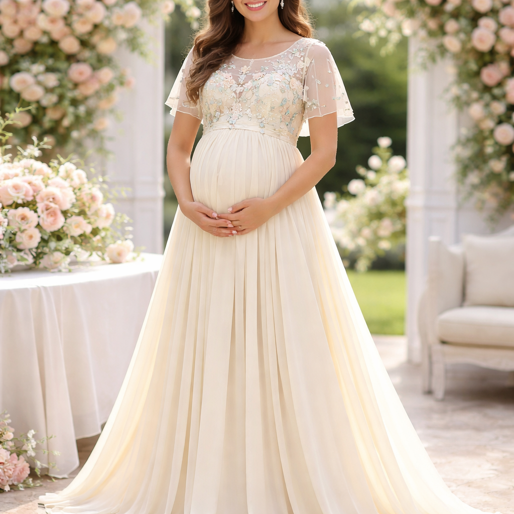 Gown for a baby shower with emroidery of pastel shades in the yoke fabric colour is ivory and fabric is flowy crepe sati...