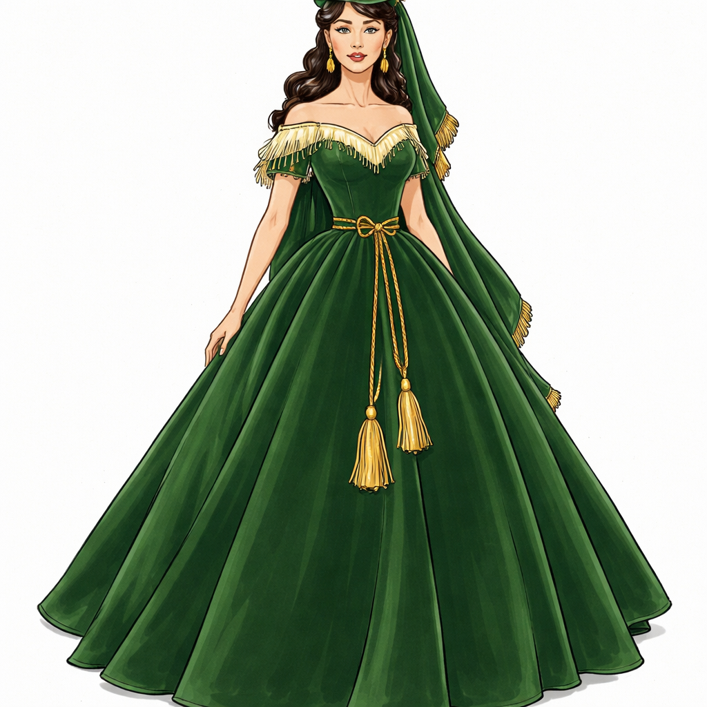 fashion sketch of Scarlett O'Hara in a green curtain dress, full length, simple drawing, flat colors, white background