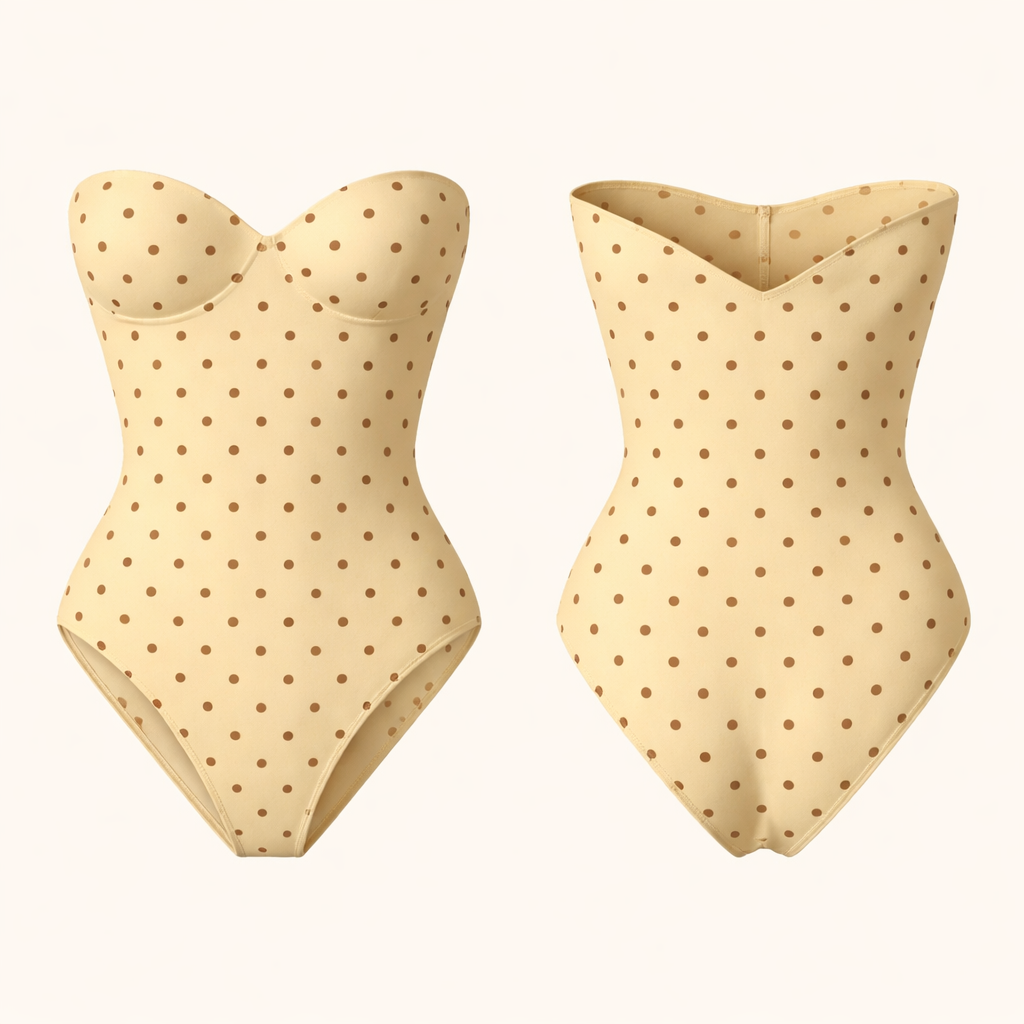 shape wear body suit strapless yellow and brown pocker dots no ai models v cut other way around all same fabric v cut, minimalist style, show front and back