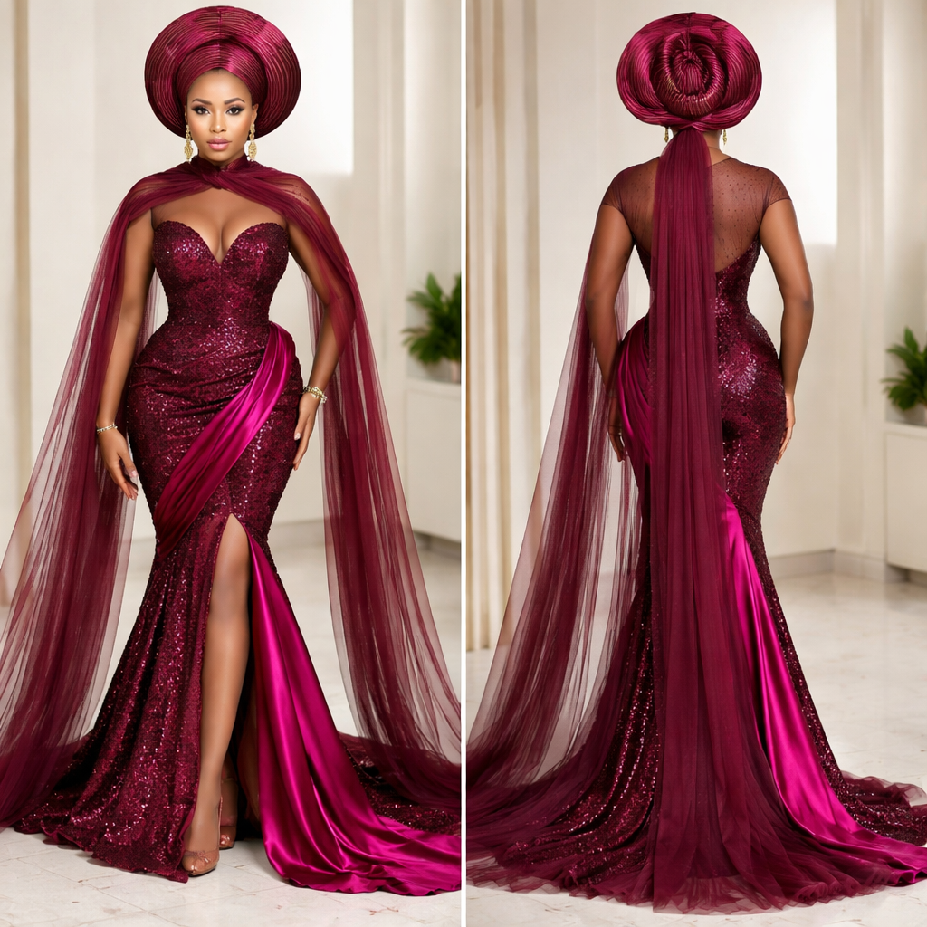 A maroon long sleeve dinner gown with a fushia pick and stripes of maroon aso eko head gele and a maroon net veil on the neck flowing don the train, show front and back