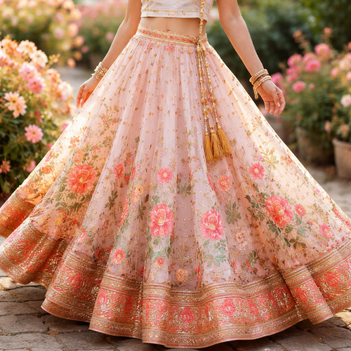 A Skirt design, suitable for Spring. Consider Indian fashion aesthetics — consider saree, lehenga, salwar kameez, kurti,...