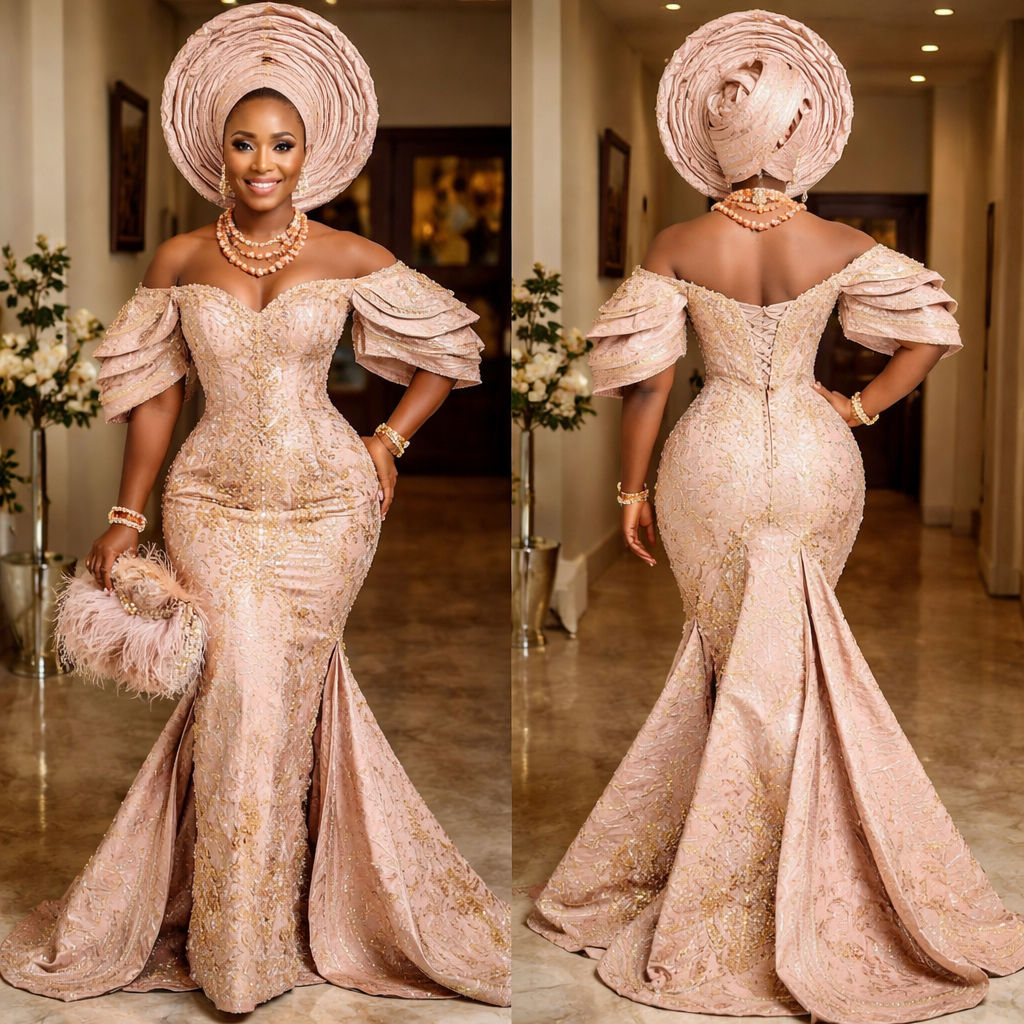 "Design a luxurious and feminine outfit, pastel colors, lace details, elegant silhouette"