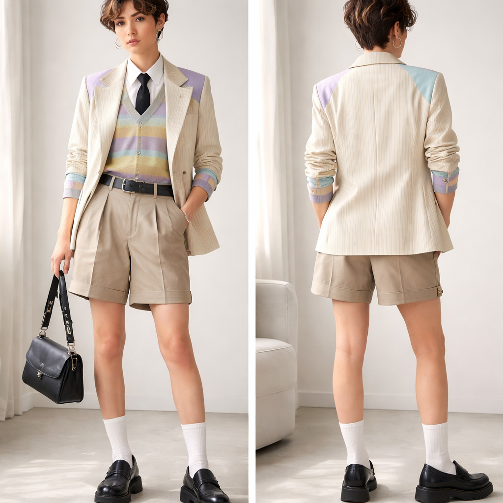 Non binary gender fluid design for female born people. Smart casual design with shorts , preppy style, show front and back