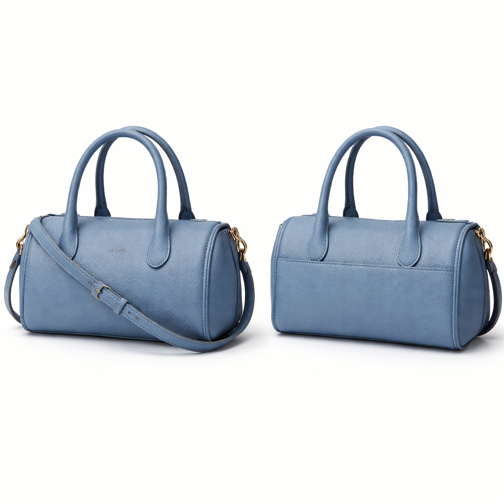Create me a highest luxury fashionable daily wear unisex bag. With rolled handels and strap. The bag must be delicate and elegant. And small enough for daily utilities. Must be in slightly textured goat skin leather in blue. Make in style of duffle bag and unisex. Less handware. Handles attached no hardware, delicate handles. Make bag overall delicate and high luxury similar to hermes , artsy style, show front and back