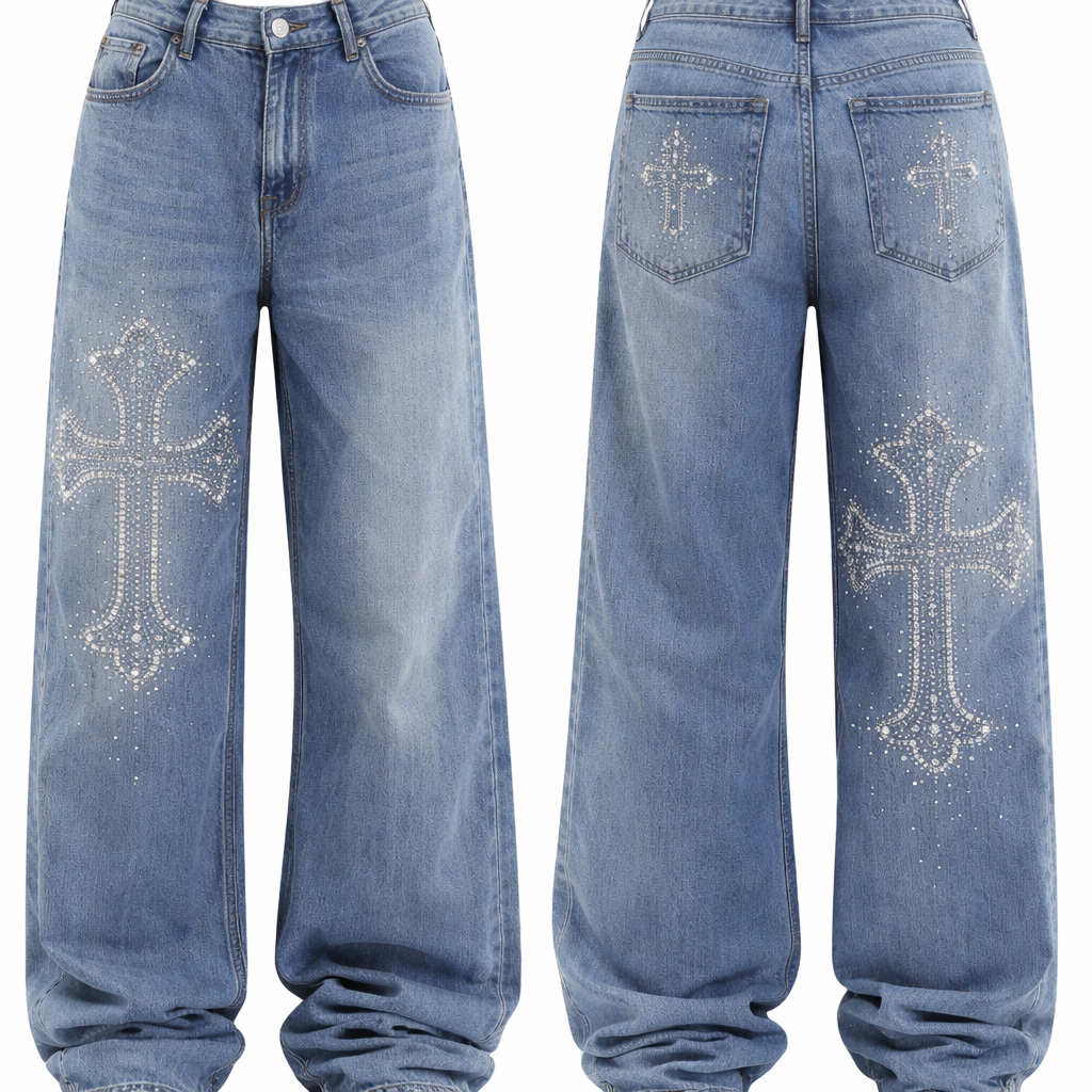 Create baggy jeans with a cross made with rhinestones