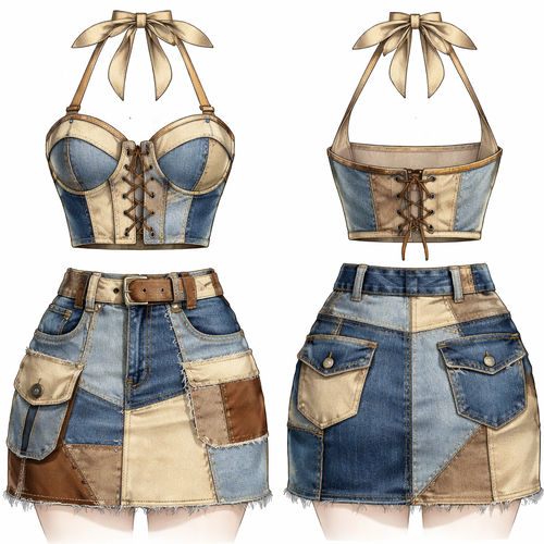 Plus size denim underbust cinched corset with loose denim scrap pieces 3d on corset in different denim colors from light...