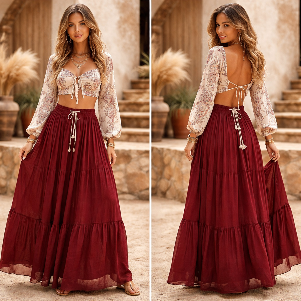 A step by step free long burgundy skirt With a patterned cream long sleeve top with a rope that ties the top to the back on it , boho_chic style, show front and back