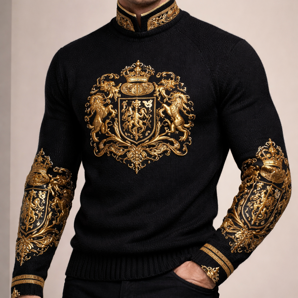 I am wanting to create a man’s wool knit long sleeve top. With heraldry style 3 D embroidery in gold, my crest from the forearms to the cuffs of the sleeve, not sure how I upload my crest? , military style