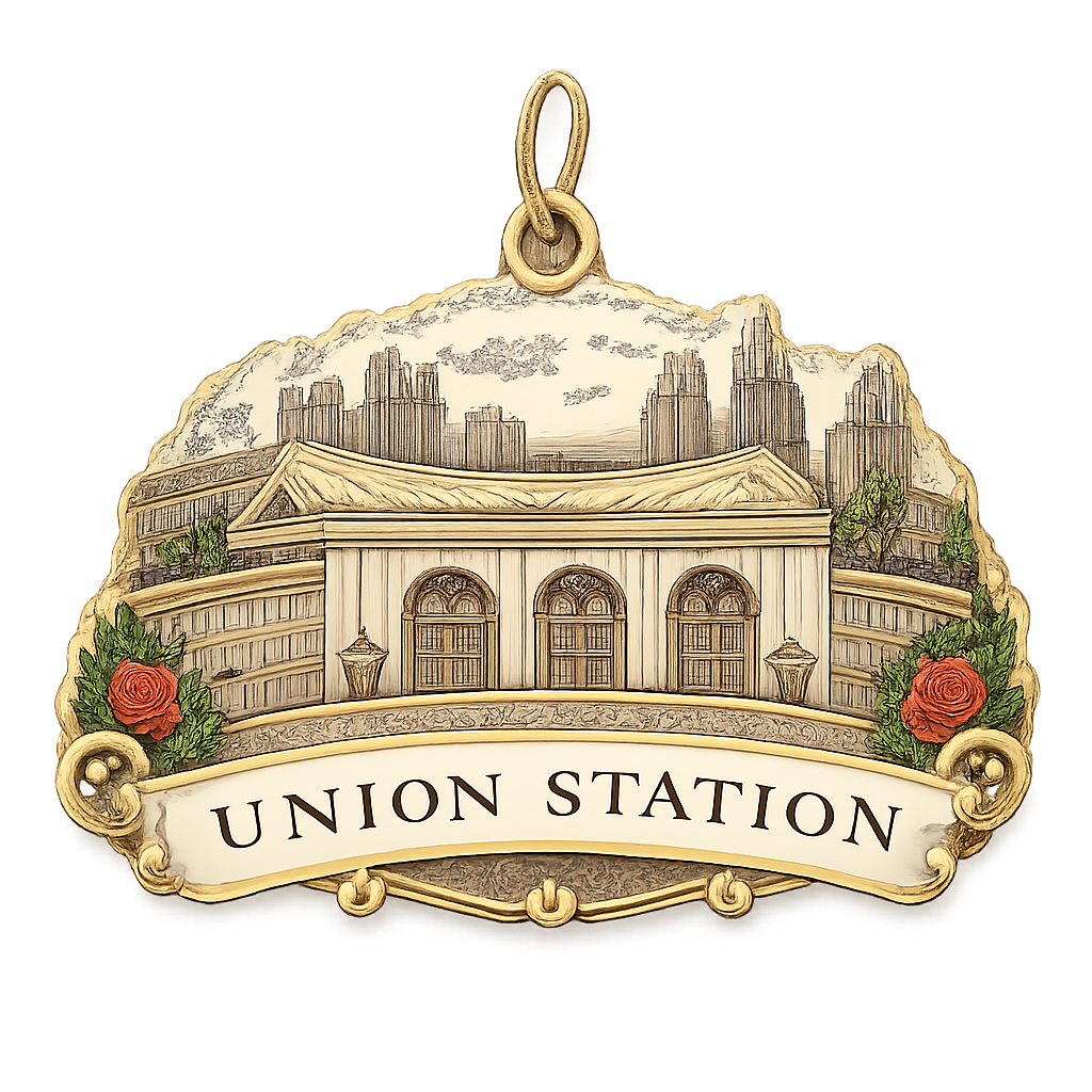 Make an enamel charm of the silhouette of Union station in Kansas City , classic style