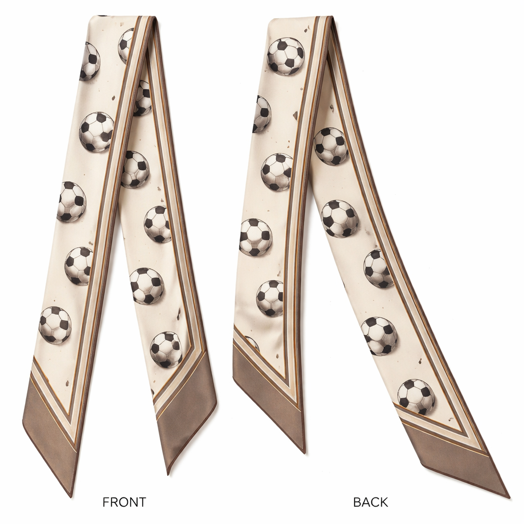 Design a silk scarf that is 5 x 86cm to be wrapped around the handle of a Kelly style bag It needs to have a tailored polished simple looks with no logos or words. Have it a repeated pattern of soccer balls. Make it old money looking more neutral , classic style, show front and back