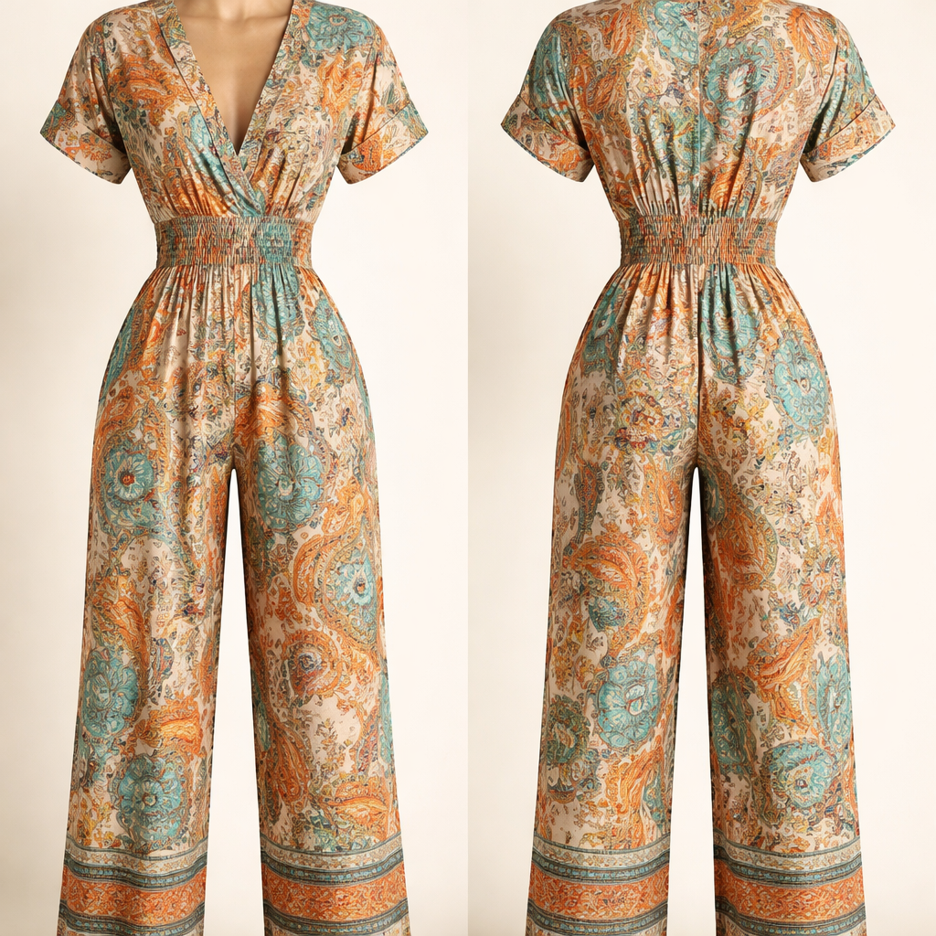 A cut together boho jumpsuit with a turn up sleeve,waist length v-neck,snatched waist with an elastic band in a casing at the back only