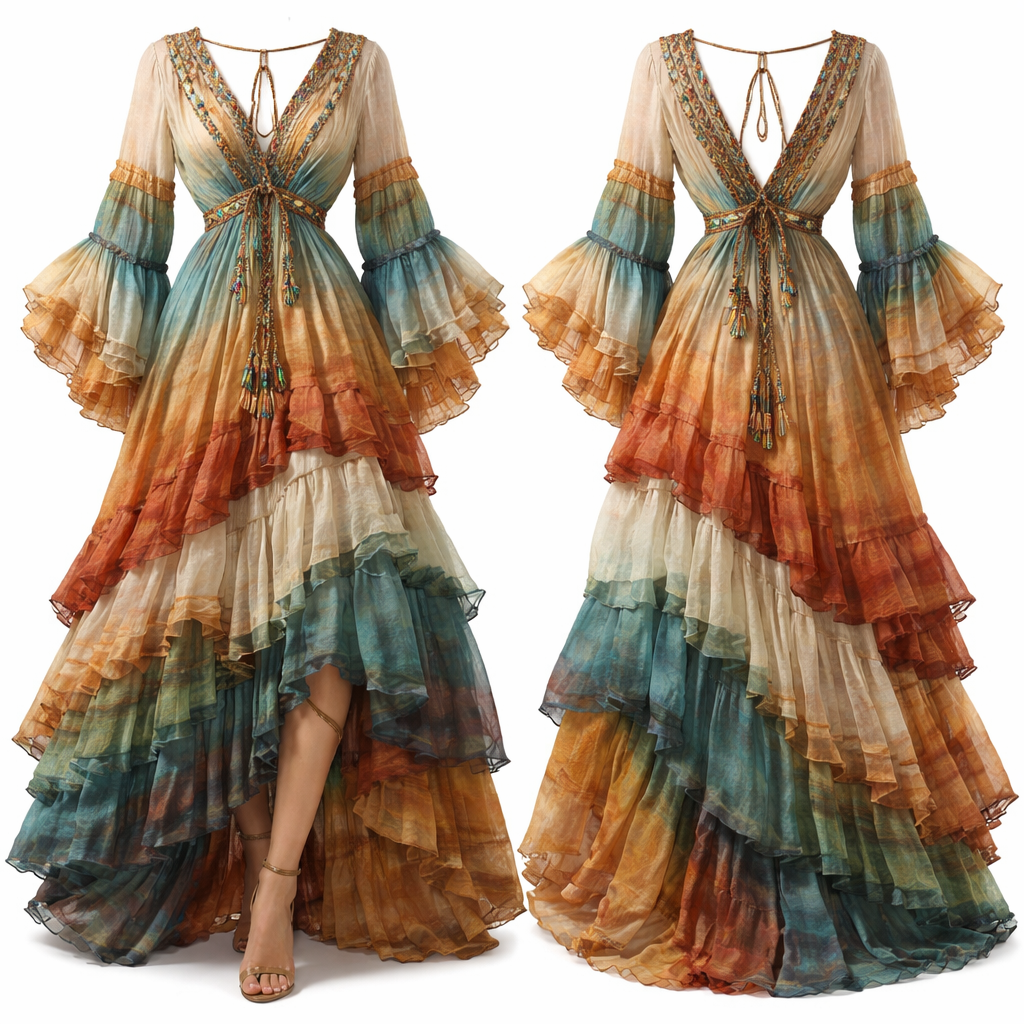 I want to create a dress inspired by the strata and colors of rock formations, bohemian style, show front and back