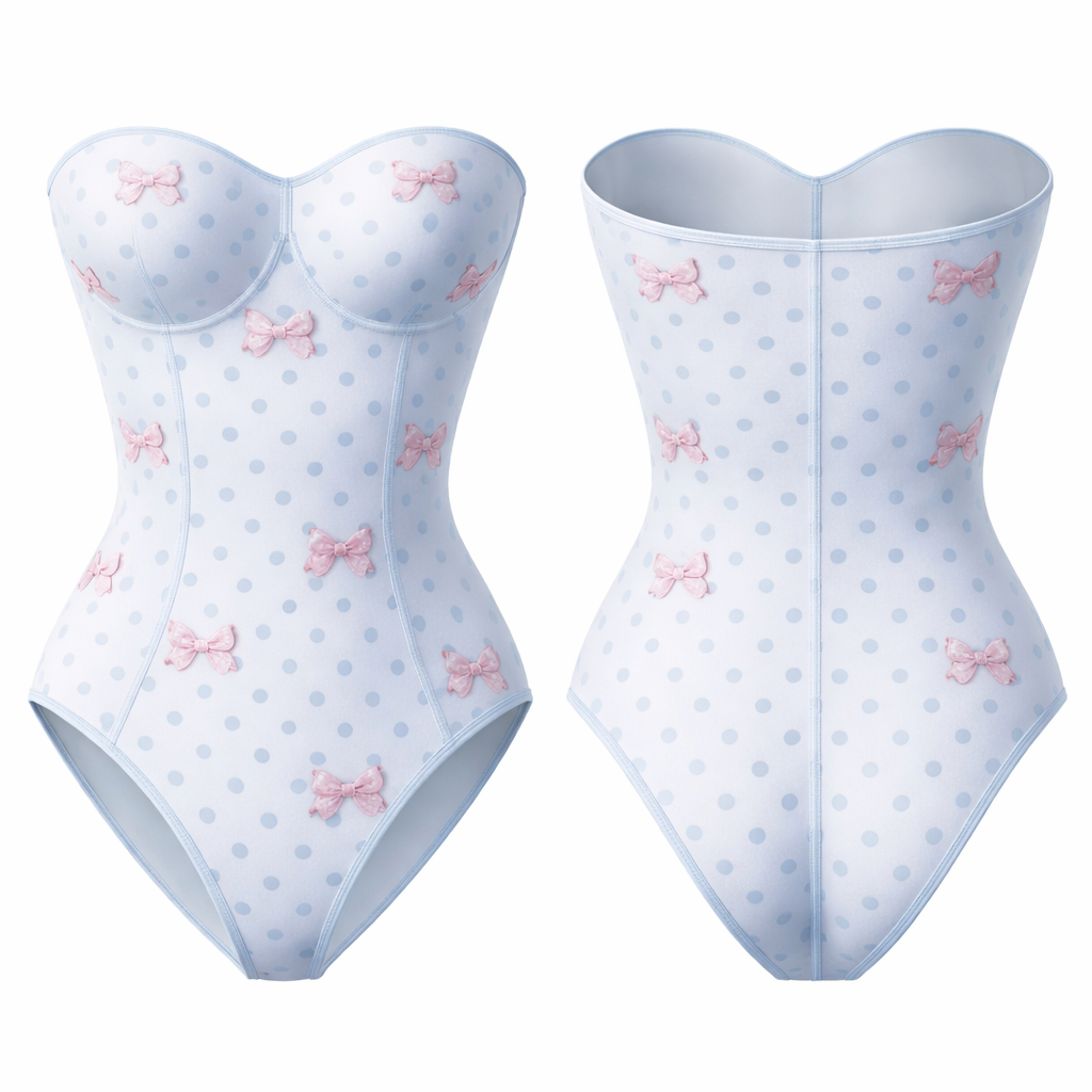 Bodysuit shape wear g string no ai model strapless no lines just no bow just string and no back open no ruffles blue white and light blue pocker dots with pink bow prints on