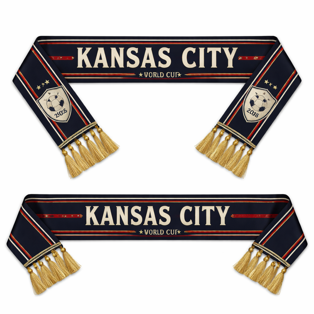 Design a scarf that is 5x86cm to be wrapped around the handle of a handbag for a lifestyle piece. Classic & Tailored World Cup 2026 – Kansas City Scarf Colors • Deep Navy – #0A1A2F • Rich Crimson – #9B1C2D • Warm Ivory – #F6F1E7 • Subtle Gold (muted) – #C2A14D Classic Design Notes (optional) • Base: Deep Navy • Secondary stripe or block: Rich Crimson • Text & crests: Warm Ivory • Fine detailing (pinstripe, border, tassels): Subtle Gold • Symmetrical layout, no gradients • Traditional block lettering or serif type