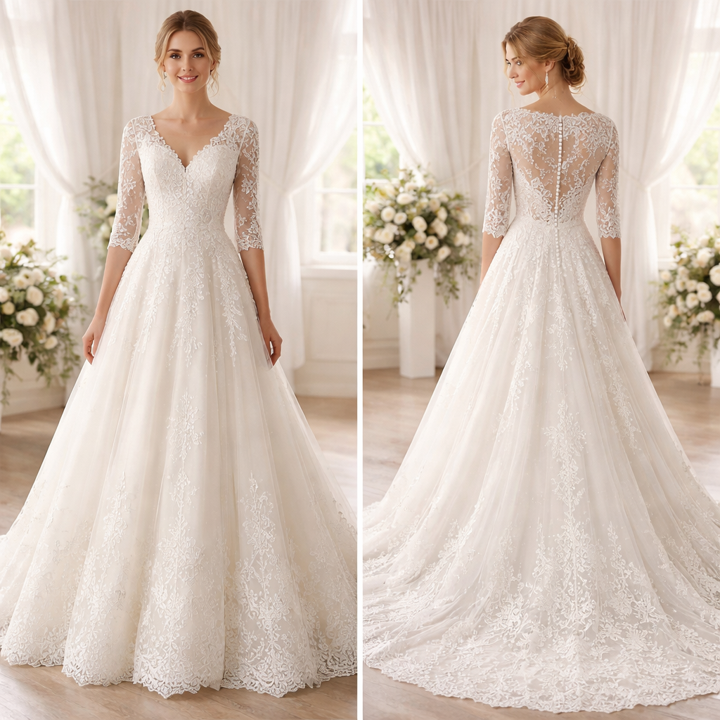 Wedding dress with v neck and 3/4 lace sleeves with a line shape, all with lace detailing