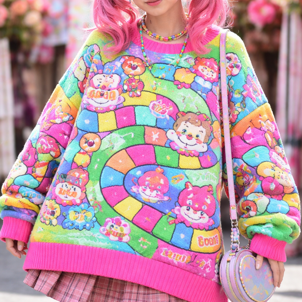 Japanese Street fashion design: **Cute oversized neon knit sweater with a bold candy land board game pattern, featuring playful cartoon characters. Made from thick cotton, this vibrant statement piece embodies eccentric Harajuku style with a relaxed, comfortable fit.**