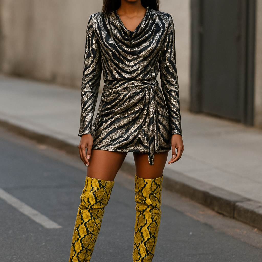 KENYA-YELLOWSNAKE WEDGE BOOT OVER THE KNEE with a Women Long Sleeve Sequin Zebra Print Cowl Neck Blouse Metallic Party Top with Sequin Zebra Print Wrap Mini Skirt With Front Tie Detail For Party Cocktail Occasion, streetwear style