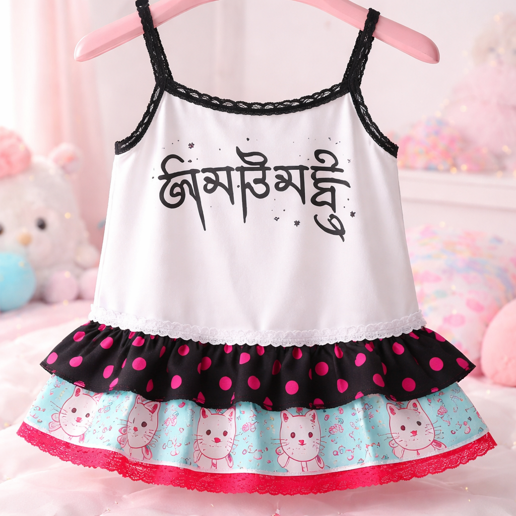 Japanese Street fashion design: Cute white cotton feminine tank top with black Tibetan alphabet graffiti, two layered ruffles at the bottom: one black with hot pink polka dots, the other with bright aqua and red striped cat line drawings. Loose, playful fit.
