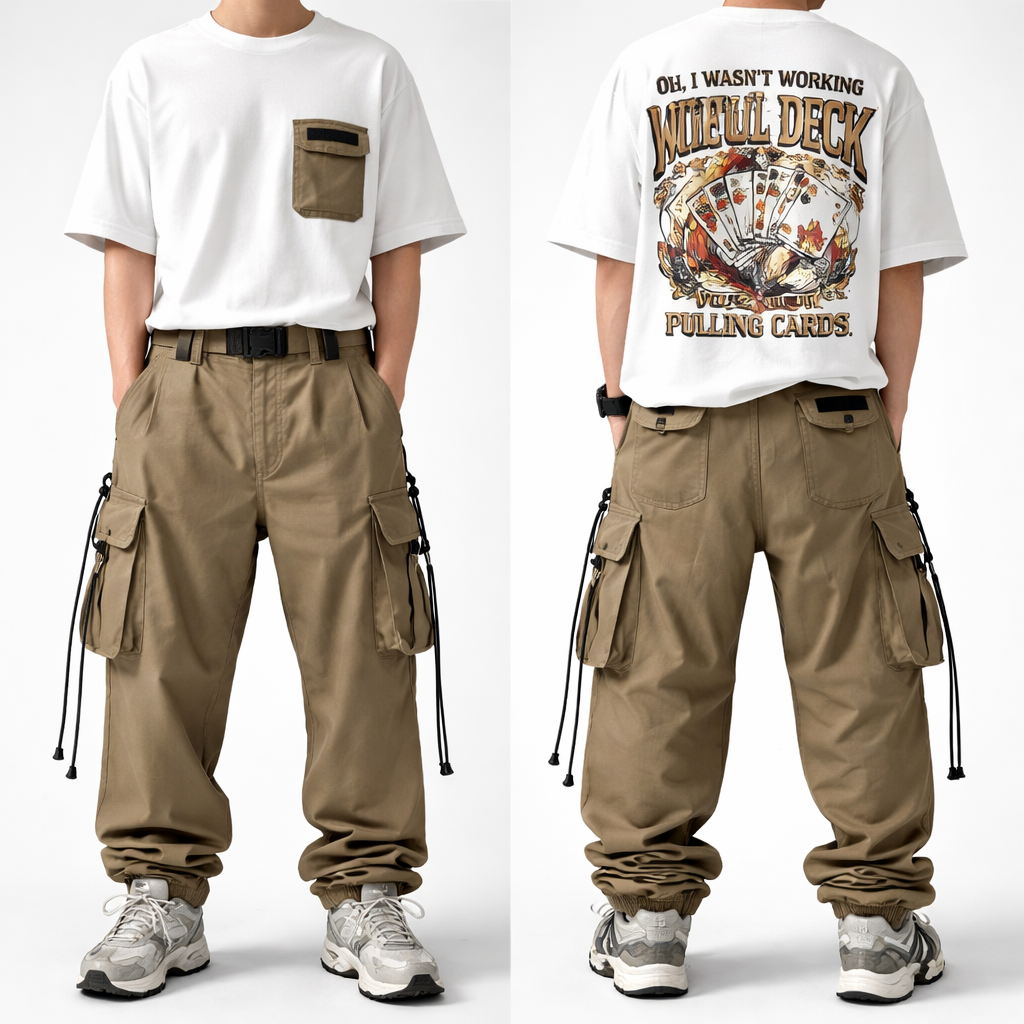 Street wear khakis pants. With large pockets on side seam . Side ribbon threaded through pockets. Buckle on front and back waist . Tshirt with cuff on sleeve pocket on front With the words “Oh, I wasn’t working with a full deck and you were pulling cards “ with deck of cards as image on back. , streetwear style, show front and back