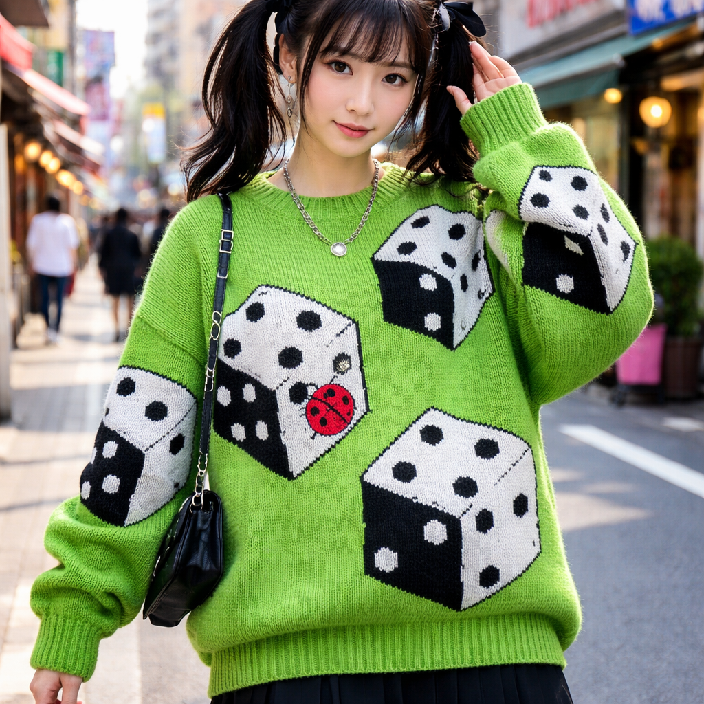 Japanese Street fashion design: Bright green cotton chunky sweater with large black and white dice pattern, featuring one red ladybug on a die face. Clean lines, oversized fit, **Harajuku style**.