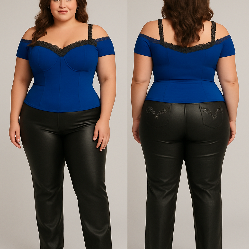 off shoulder blouse royal blue make it more form fitting in the waist with a bra type breast outline in darker blue stitching and lace. with black lace straps. for plus size women. pair it with some leather black pants that are straight leg. with some rhinestones on the back pockets. then add cowboy boots that are black with silver diamond rhinestones , country style, show front and back