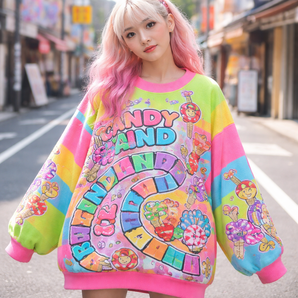 Japanese Street fashion design: **Oversized cotton sweater in bright neon colors, featuring a playful cartoon candy land board game pattern. Drop shoulders and wide sleeves for a relaxed, urban fit.**