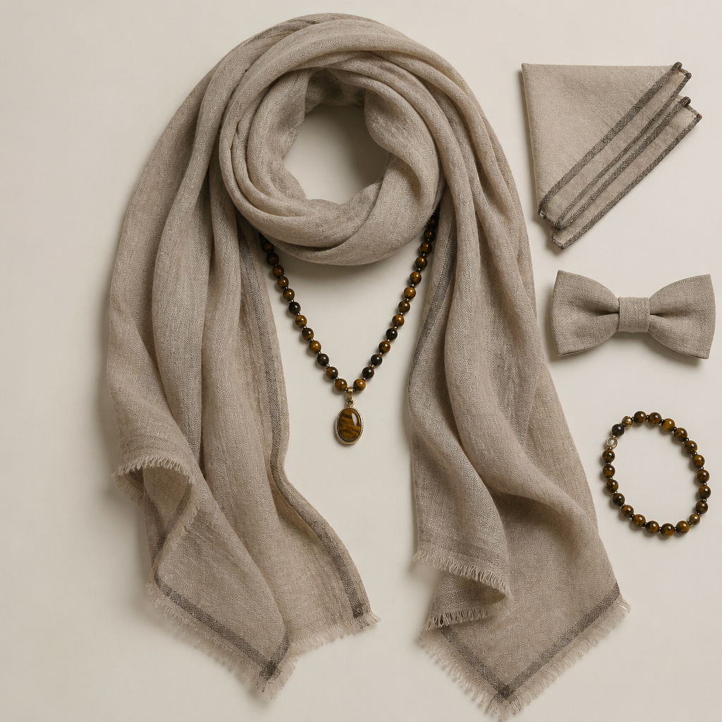 A Male Accessories design, made of Linen, for Date Night, in British + Ethical + Boho Chic style. tiger eye, detailed. Design with modest coverage.