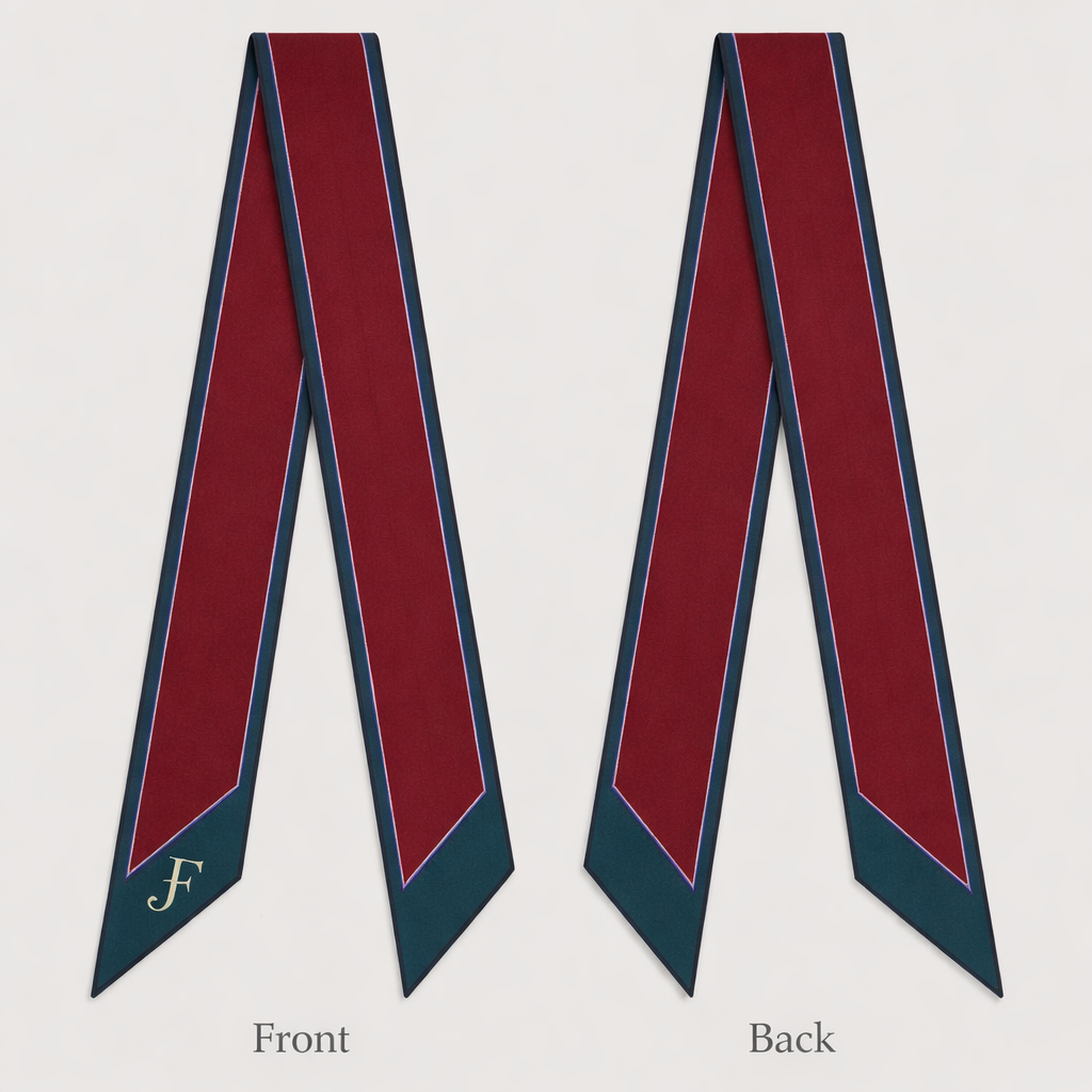 Design a twilly scarf that is 5 x 86cm with oblique edges. Have it be mostly deep red/ maroon with teal accent Keep it super simple and tailored Add JF initial at the bottom, classic style, show front and back