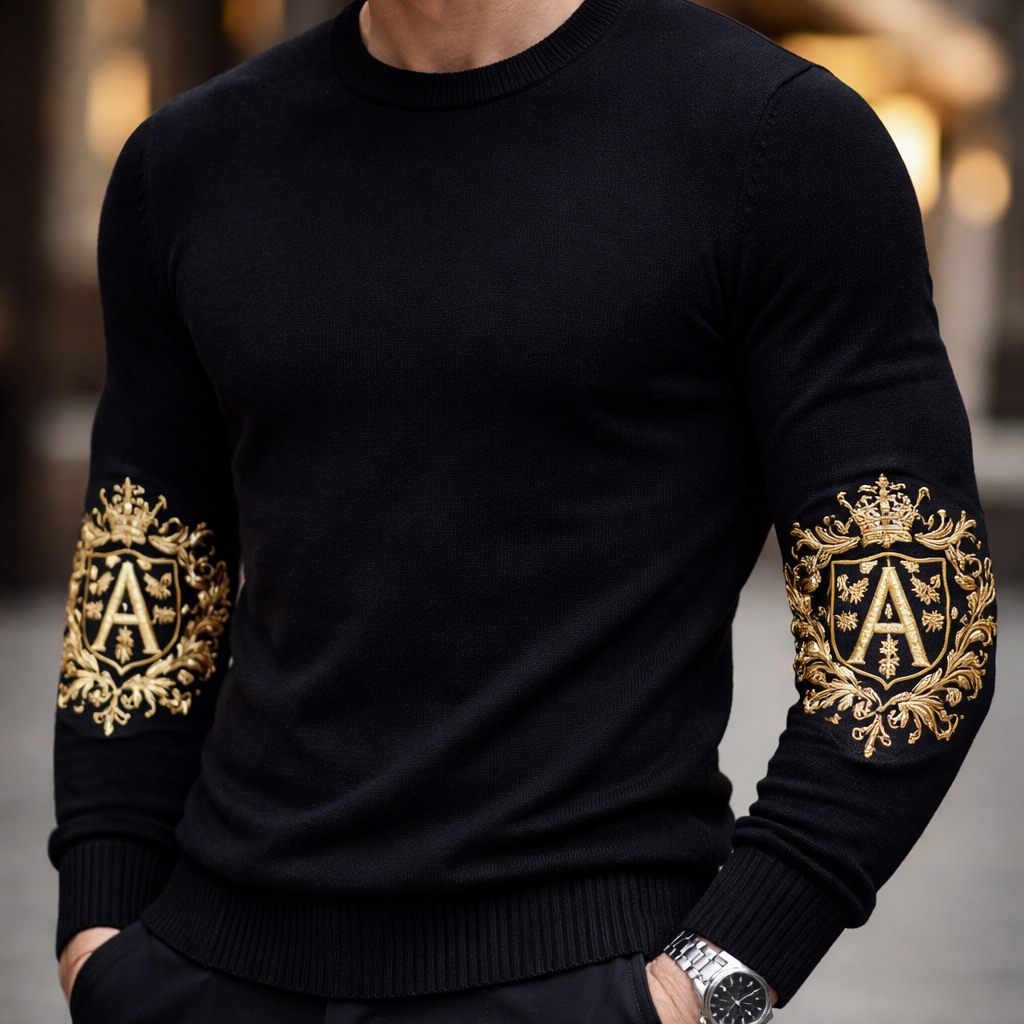 7:48 I am designing a man's long sleeve wool slim fit top. .0 24 Only on the forearms I want my crest which is sureounded by heraldry filigree all headed by a crown In the centre of the crest is a Lambda upper case A inside the A is a Christian cross On one side of thr crosses flanks is the letter R and on the other side thr letter C. This is all working thr A There is a heraldry crown above the ^ Placement: Epaulettes Because the design is situated on the forearm area, it mimics the "epaulette" or "forearm found on Roman Empire and Spartan traditional armour. In this case, it appears to be a raised panel that has been integrated into the knit of the sweater to provide a structural base for the decoration. 2. Technique: Bullion Embroidery The style of the gold work is likely Bullion Wire Embroidery (also known as Goldwork). This is a traditional method used for military crests and high-end heraldry. • It uses fine wire threads (often gold or silver-plated) rather than standard polyester or rayon thread. • It creates a high-relief, 3D effect that is far more rigid and reflective than standard flat embroidery. 3. Application: Patch vs. Direct Looking at the edges of the gold crest, it is most likely a Pre-made Embroidered Patch (Appliqué) that has been stitched onto the forearm panel. • Why a patch? High-density bullion work is very heavy. Embroidering it directly onto a flexible knit sweater would cause the fabric It’s really important that the crest is on the forearm Not upper arm at all And not anywhere else , luxury style