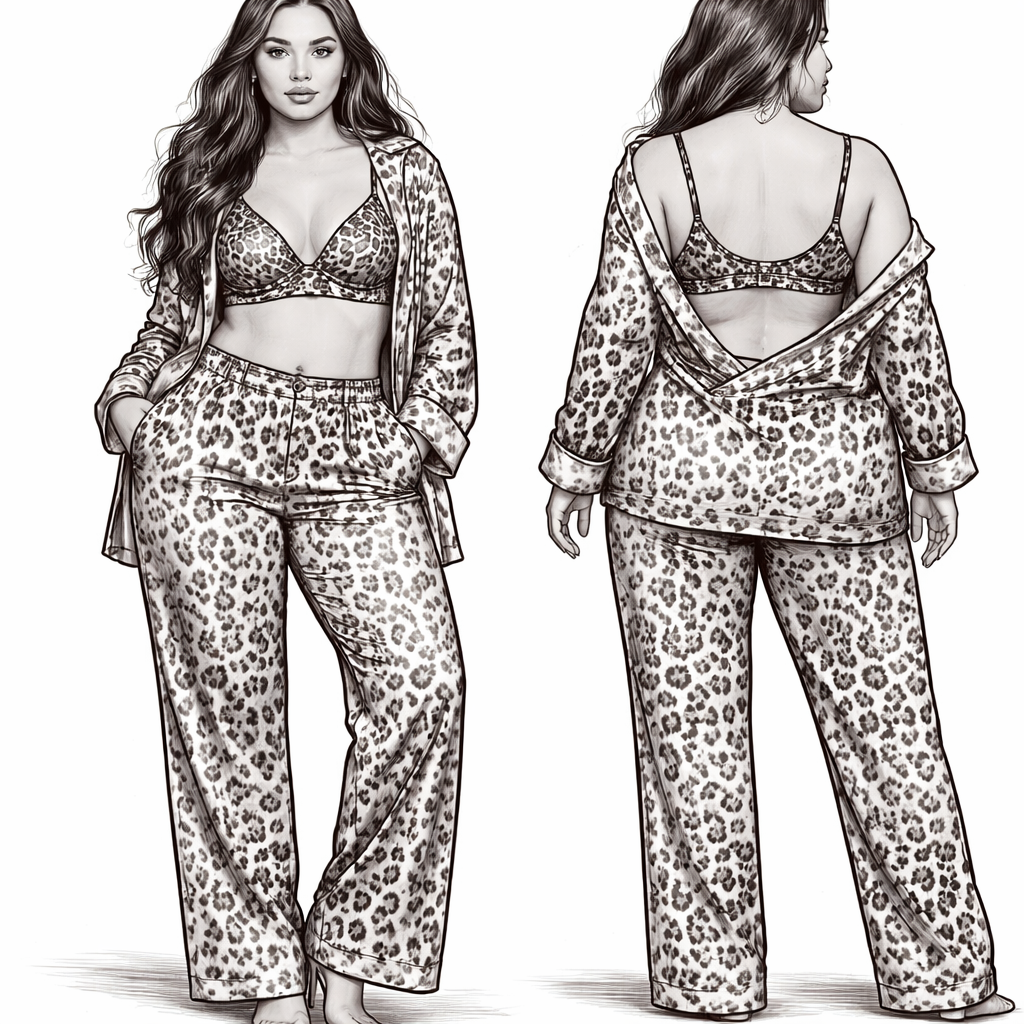 Ik want a fashion sketch of a front and back with a brallete in cheetah print. Like in the skims style. In black and white. With a cheetah print pyjama blouse and pants. On a person thats a bit thick. No strings on the pants and make the brallete a bit sexy , sleepwear style, show front and back