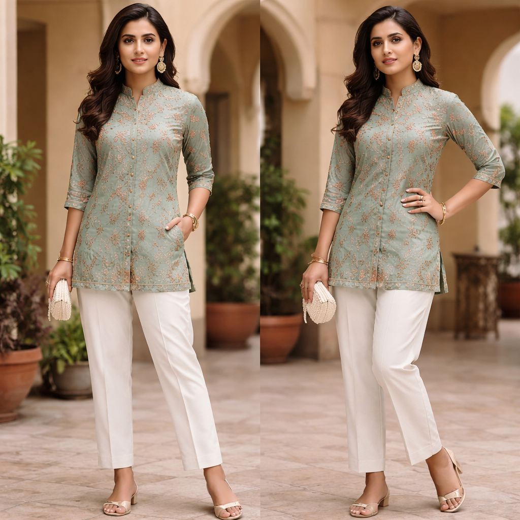 Blazer ceintré extra long avec pantalons droit , femme voilée