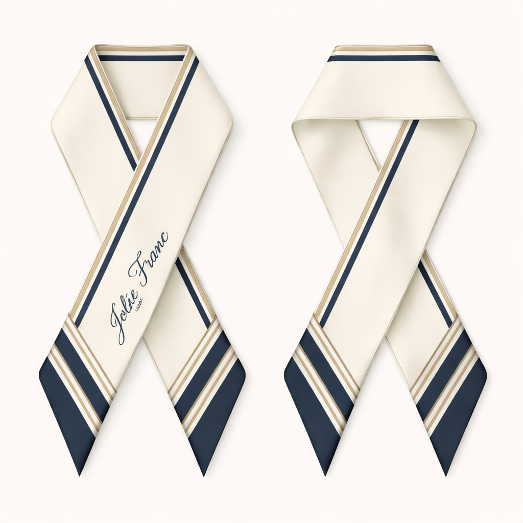 Design a silk scarf thanks 5x 86cm to be wrapped on the handle of a purse. No logos or any school relation but a collegiate feel. Create a signature look for my brand Jolie Franc. Keep it simple and tailored Ivory combination, classic style, show front and back