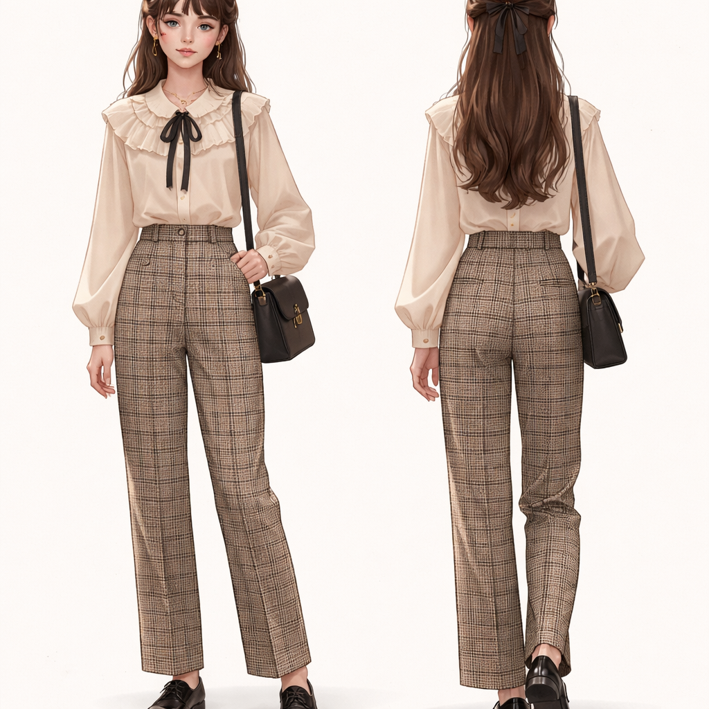 A 16 year old Girl with French Face has brown hair in a bow wears beige blouse with houndstooth pants in beige and black and black Oxford shoes , light_academia style, show front and back