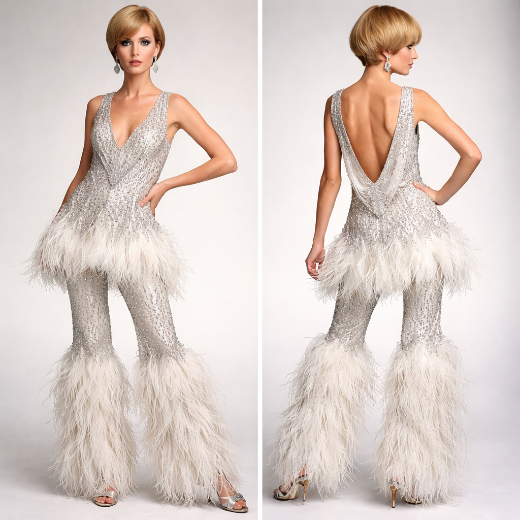 Arnold Scaasi evening pajamas 1966 , flapper style, show front and back