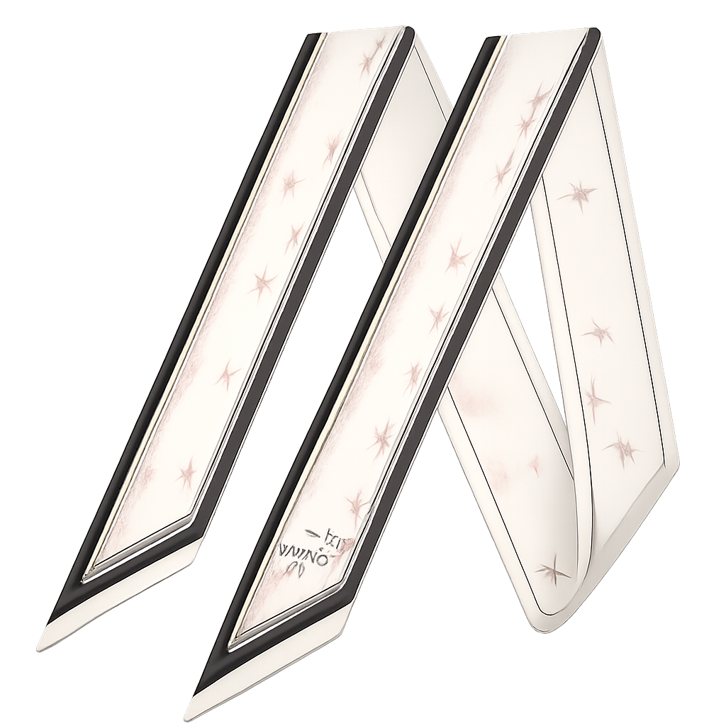 Prompt: Create a luxury silk twilly for a high-end fashion brand called Jolie Franc. Size: 5 cm x 86 cm (2” x 34”). Designed to wrap around the handle of a handbag, fold, or twist elegantly. Base color: soft cream, ivory, or subtle pastel. Borders: refined, clean geometric or linear pattern along the long edges in deep black or dark espresso, with optional micro-accents in antique gold. Sophisticated and symmetrical, not ornate or busy. Center / Field: minimal and elegant, with subtle abstract motifs such as tiny brush strokes, geometric forms, or micro floral designs. Negative space should dominate to allow the scarf to pair seamlessly with any handbag. Logo / Signature Detail: • Small, elegant “Jolie Franc” signature in refined serif or delicate script, subtly positioned near one end or along the edge. • Optional micro-monogram or icon subtly integrated into the pattern. Color Palette: soft cream/ivory, deep black, antique gold, optional muted accent (blush, navy, deep green). Overall Style: iconic, timeless, understated luxury. Not trendy, not kitsch, no sports or logos. The scarf should look elegant wrapped on a bag, feel collectible, and instantly convey the Jolie Franc brand identity., show front and back