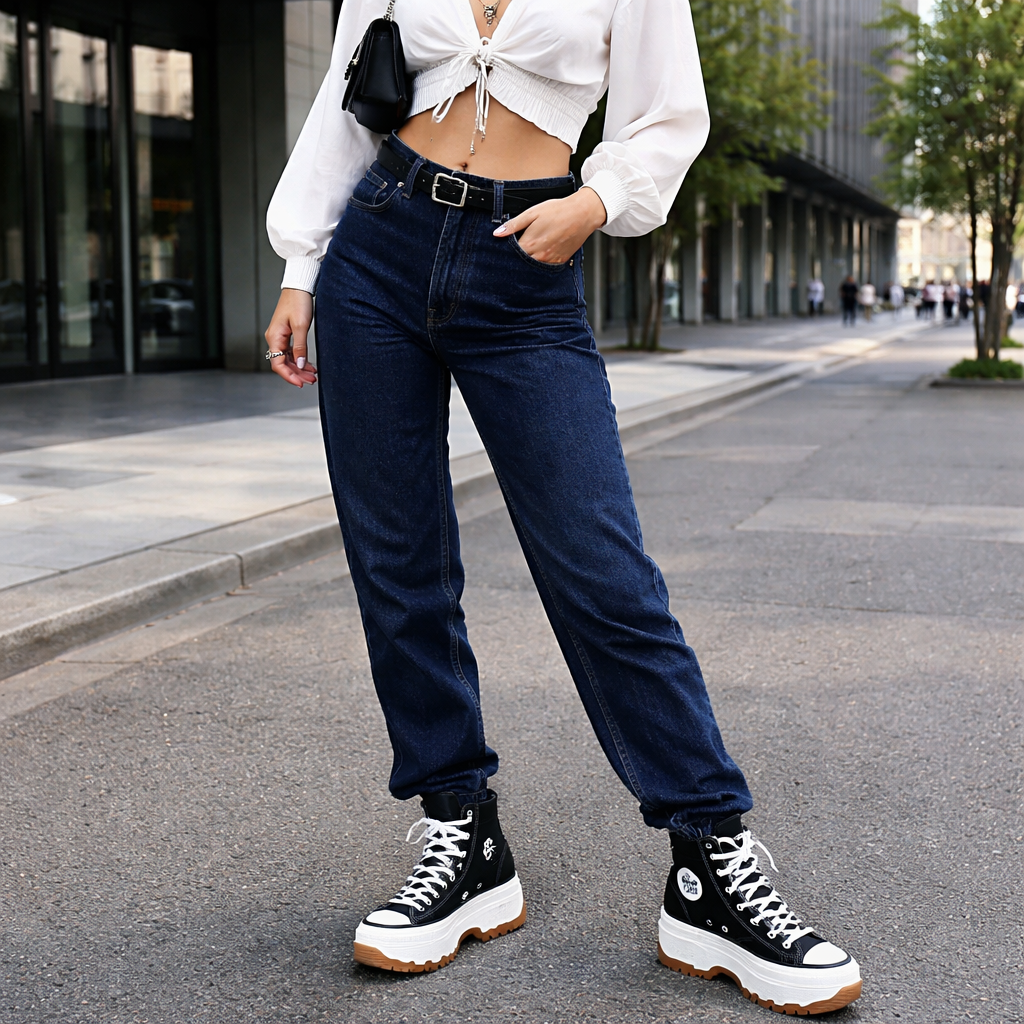 Converse all star hike and white blouse on dark blue jeans crop , streetwear style